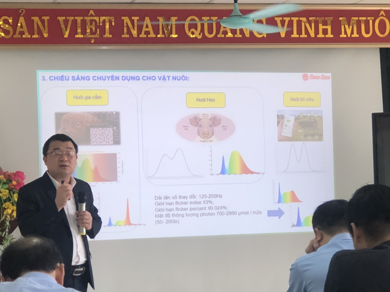 Tại Hội thảo, ông Nguyễn Hồng Thu - đại diện công ty CP Bóng đèn Phích nước Rạng Đông đã giới thiệu về các thành tựu và công nghệ ứng dụng mới nhất về chiếu sáng nhân tạo trong nông nghiệp công nghệ cao, chiếu sáng sử dụng năng lượng mặt trời, chiếu sáng cho kiến trúc, cảnh quan; giới thiệu một số mô hình, công nghệ, giải pháp và kỹ thuật chiếu sáng cụ thể đã được ứng dụng thực tế đem lại hiệu quả cao. Việc chiếu sáng sử dụng Led thay thế các nguồn sáng truyền thống đã tối ưu hóa ánh sáng cho các công nghệ thông minh ứng dụng trong nông nghiệp công nghệ cao, nông nghiệp chính xác. Ứng dụng công nghệ thông minh Smart Fam kết hợp sử dụng ánh sáng nhân tạo đúng/đủ bao gồm hệ thống điều khiển trung tâm; cảm biến ánh sáng nông nghiệp; cảm biến nhiệt độ, độ ẩm nông nghiệp; cảm biến khí CO2 nông nghiệp và cảm biến độ ẩm đất nông nghiệp. Công ty CP Bóng đèn và Phích nước Rạng đông có các sản phẩm nổi bật phục vụ chiếu sáng nông nghiệp công nghệ cao như: Dàn chiếu sáng trong nông nghiệp cho cây thanh long, đèn hoa cúc, đèn trồng rau, đèn nuôi tảo, đèn sâm/dược liệu, đèn côn trùng, đèn nhà kính, nhà màng, chiếu sáng nuôi cấy mô, đèn đông trùng hạ thảo, đèn gia cầm, các hệ thống cảm biến… Ngoài tiết kiệm điện năng, ứng dụng chiếu sáng bằng đèn led mang lại hiệu suất năng lượng sinh học cao, từ đó kích thích sự phát triển của cây trồng hơn so với các loại bóng đèn truyền thống. Việc dùng đèn led trong nông nghiệp còn giúp cải thiện chất lượng nông sản, giúp tăng giá trị dinh dưỡng, giảm nồng độ nitrat của rau quả, tạo ra các sản phẩm sạch, trái vụ, có giá trị kinh tế cao.