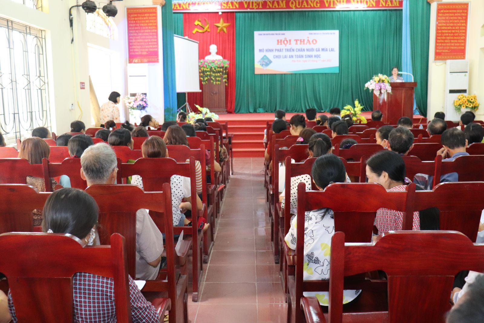 Mới đây, tại hội trường UBND xã Hợp Đức, Trung tâm Khuyến nông tổ chức hội thảo mô hình phát triển chăn nuôi gà mía lai, chọi lai an toàn sinh học.