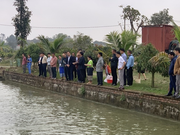 Cùng ngày, đoàn đến tham quan mô hình chăn nuôi vỗ béo bò thịt giống BBB tại hộ ông Hoàng Hữu Hùng, xã Cảnh Thụy, huyện Yên Dũng, quy mô 90 con/năm và mô hình nuôi cá Trắm đen thâm canh trong ao tại hộ nhà ông Phan Văn Thiệu xã Đức Giang, quy mô 8000m2, năng suất đạt 8-10 tấn/năm.