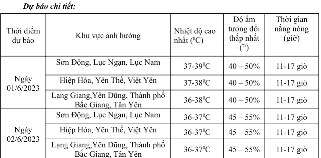 3. Cảnh báo: Đợt nắng nóng diện rộng này ở tỉnh Bắc Giang có khả năng kéo dài đến khoảng ngày 03/6. Từ ngày 04/6, nắng nóng dịu dần.