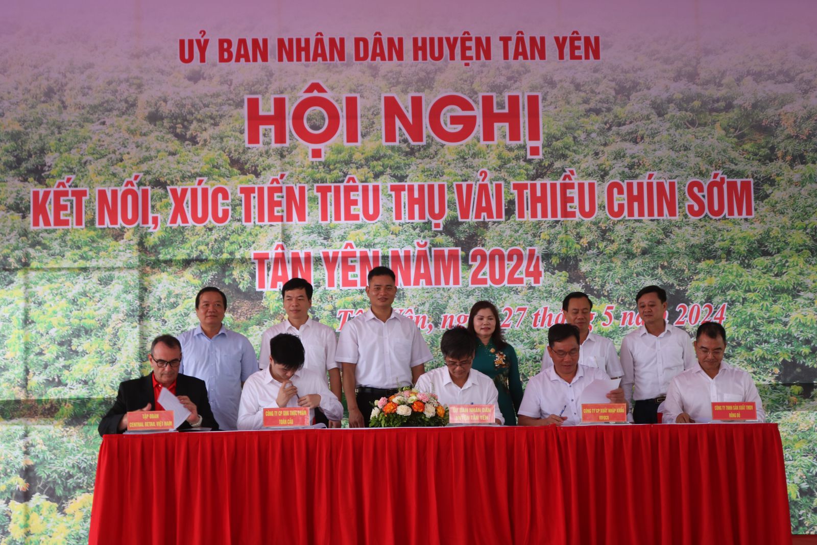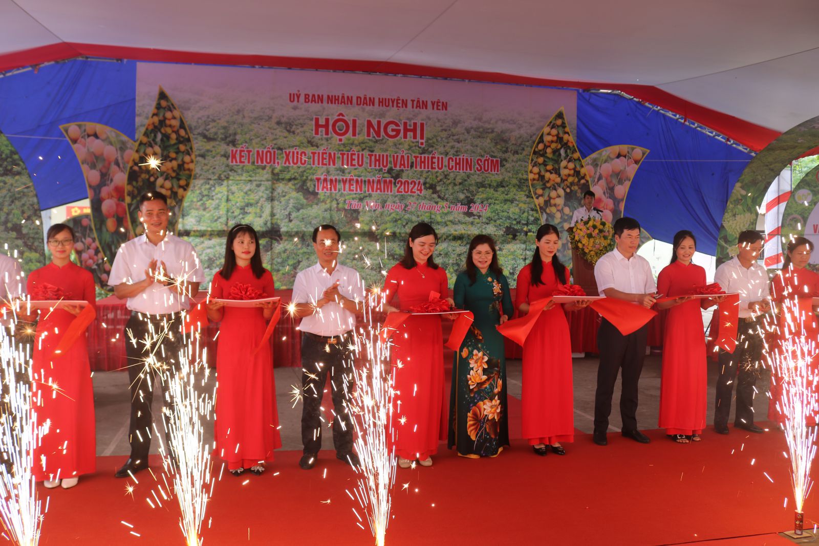 Tại hội nghị đã diễn ra hoạt động ký kết Biên bản ghi nhớ kết nối, xúc tiến tiêu thụ vải thiều chín sớm giữa huyện Tân Yên, các doanh nghiệp, sàn thương mại điện tử, các đơn vị lữ hành dưới sự chứng kiến của bà Lâm Thị Hương Thành – Phó Chủ tịch thường trực Hội đồng nhân dân tỉnh, các lãnh đạo huyện ban ngành trong tỉnh; Các đại biểu cắt băng xuất hành chuyến xe đưa vải thiều chín sớm tiêu thụ tại thị trường trong nước và quốc tế.