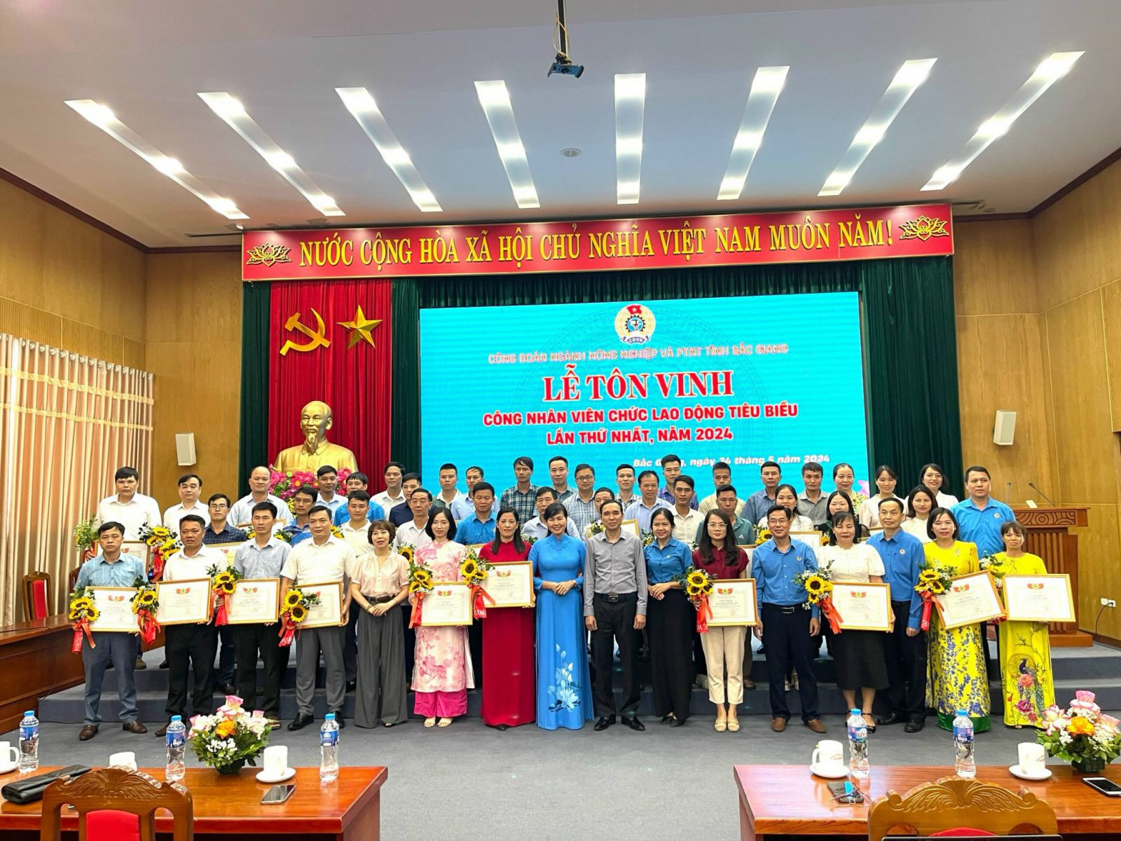 Nhằm tuyên truyền, quán triệt sâu sắc tư tưởng của Chủ tịch Hồ Chí Minh về thi đua ái quốc, kỷ niệm134 năm ngày sinh Chủ tịch Hồ Chí Minh, kỷ niệm 138 năm ngày Quốc tế Lao động và đặc biệt hướng tới Kỷ niệm 95 năm Ngày thành lập Công đoàn Việt Nam (28/7/1929 - 28/7/2024). Mới đây, tại Trung tâm Hội nghị tỉnh Bắc Giang, Ban Thường vụ Công đoàn Ngành Nông nghiệp và PTNT Giang long trọng tổ chức Lễ tôn vinh Công nhân viên chức lao động tiêu biểu Ngành Nông nghiệp và PTNT lần thứ nhất năm 2024.
